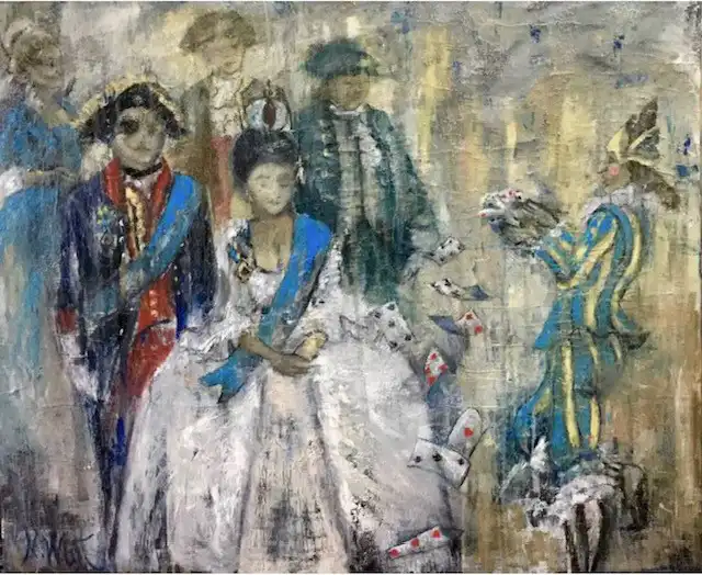 The painting’s cool palette of blues and whites, accented by touches of red, brings an ethereal, almost frosty quality to the canvas, reflecting the elegance and intrigue of 18th-century Russian nobility. The flying playing cards, delicately rendered, add a touch of whimsy and mystery, suggesting themes of fate and fortune in the lives of the depicted figures. The Impressionistic style, with soft brushstrokes and a diffused color scheme, evokes the elusive nature of history, creating a scene that feels both regal and dreamlike. Perfect for living rooms, studies, or gallery spaces, "Fortune" is an artwork that captures the viewer’s imagination, inviting them into a fantastical interpretation of a historical moment. This piece’s blend of history, fantasy, and refined color palette adds sophistication and narrative depth to any space.