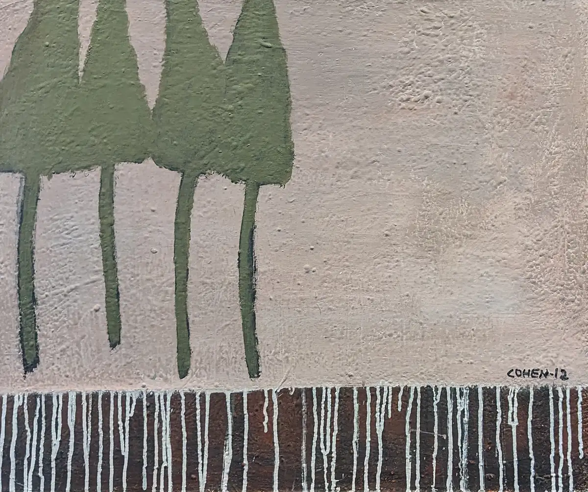 In "Four Trees," the artist Mordechai Cohen presents a series of abstract tree-like forms that dominate the upper half of the canvas. The background employs a textured beige palette, providing a stark contrast to the green and brown hues. The painting uses industrial paints and tar, contributing to the rough, tactile quality of the work. The vertical drips of white paint suggest a deconstructive force against the solid, earthy presence of the trees. This piece captures a tranquil yet slightly melancholic atmosphere, inviting contemplation on the interplay between nature and human-made structures. The painting's size and theme make it suitable for personal spaces where reflection and a connection to nature are desired.