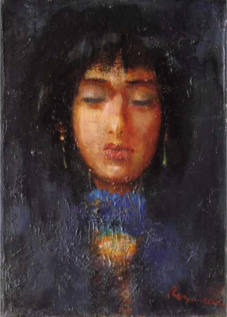 The deep blacks and rich blues dominate the background, creating a dramatic contrast that enhances the warmth of the earthy skin tones. Muted gold and subtle highlights gently illuminate the face, emphasizing the expressive nature of the painting. The textured brushwork adds to its poetic charm, making it a truly captivating piece.