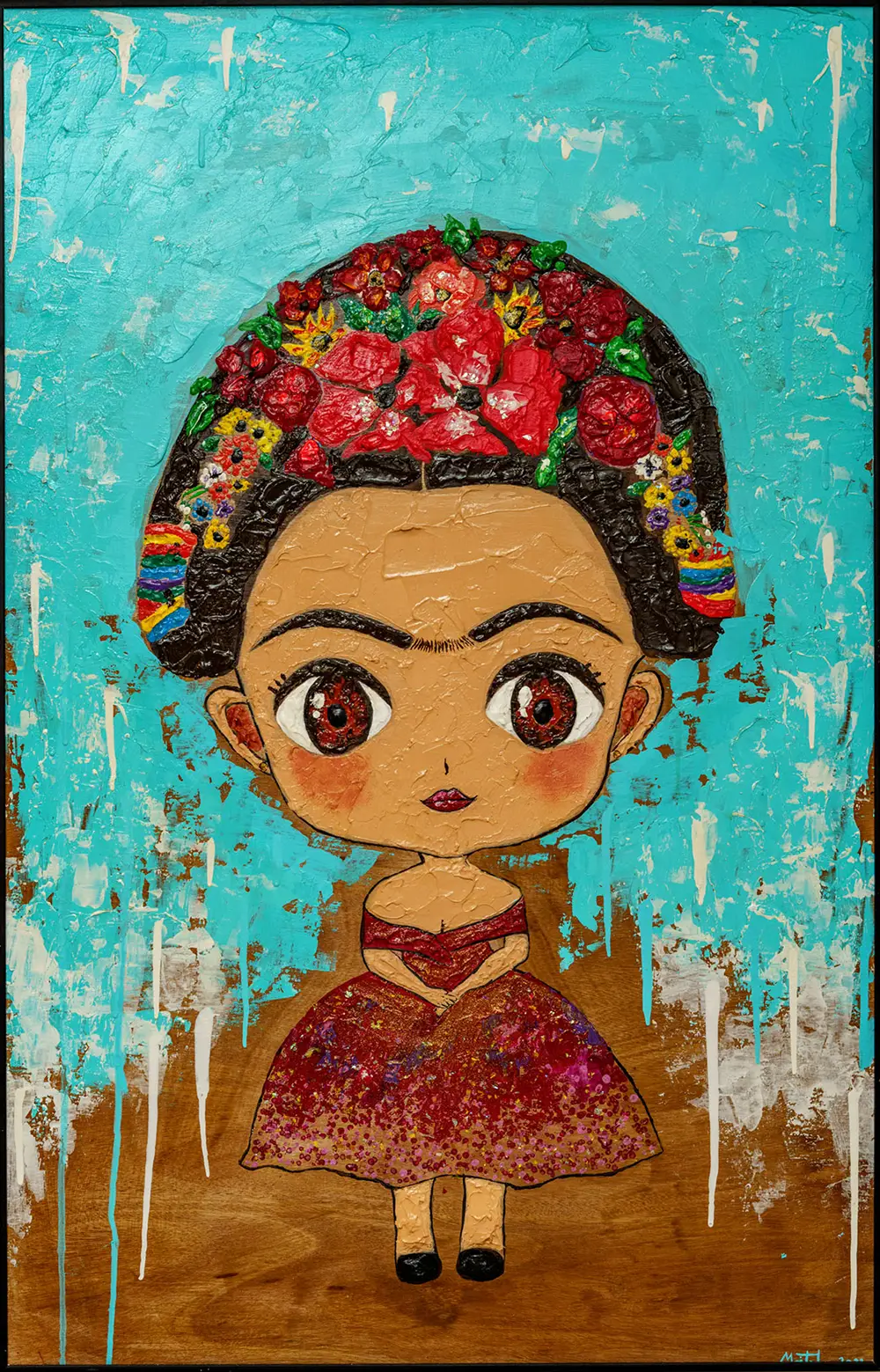 In this painting titled "Frida Kahlo", the artist pays homage to the famous painter through a caricatured portrayal that exudes charm and intensity. The subject is centrally positioned against a bright teal background, her gaze compelling and deep. Technical characteristics are notable in the thick application of paint, especially in the floral headdress, which stands out with its rich texture and assortment of colors. The earth-toned foreground complements the vivid, textured background, creating a contrast that draws attention to the figure. The aesthetic style is whimsical yet profound, reflecting Frida Kahlo's own approach to her art and life. The mood is one of introspection and boldness, and the theme revolves around artistic identity and cultural heritage. The emotional and conceptual characteristics revolve around admiration and the embodiment of strength despite adversity. Given its size and the vibrancy of its palette, this piece would make a commanding statement in a spacious room, such as a reception area, dining room, or a large hallway.