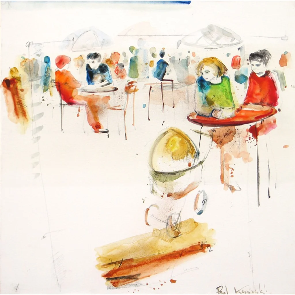 The painting’s abstract style and vibrant color palette create a warm, lively atmosphere. Using shades of yellow, red, and blue, the artwork invites viewers to feel the nostalgia and comfort of shared moments. Perfect for cozy interiors, this piece by Kaminski celebrates the simple joys of connection and urban life."