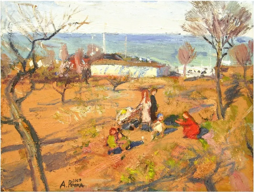 The figures, painted in a loose yet dynamic style, convey the essence of playfulness and connection. The beach setting, bathed in warm sunlight, adds a serene yet vibrant atmosphere to the composition. Repka’s masterful use of color and texture transforms a simple moment into a timeless and expressive work of art.