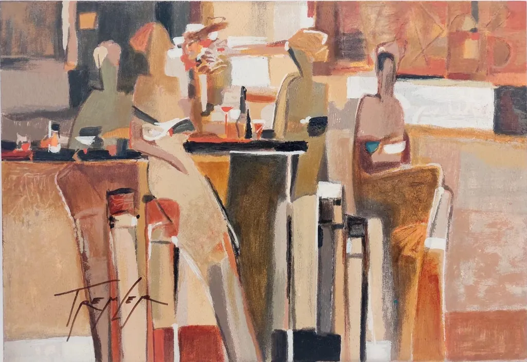 Tremler’s signature artistic approach conveys both the intimacy and vibrancy of the moment, where abstracted figures gather around tables engaged in conversation. His fragmented yet fluid brushwork enhances the painting’s dynamic composition, allowing the viewer’s imagination to complete the scene. The careful balance of bold structure and soft textures adds a layer of sophistication, making this piece an eye-catching focal point.