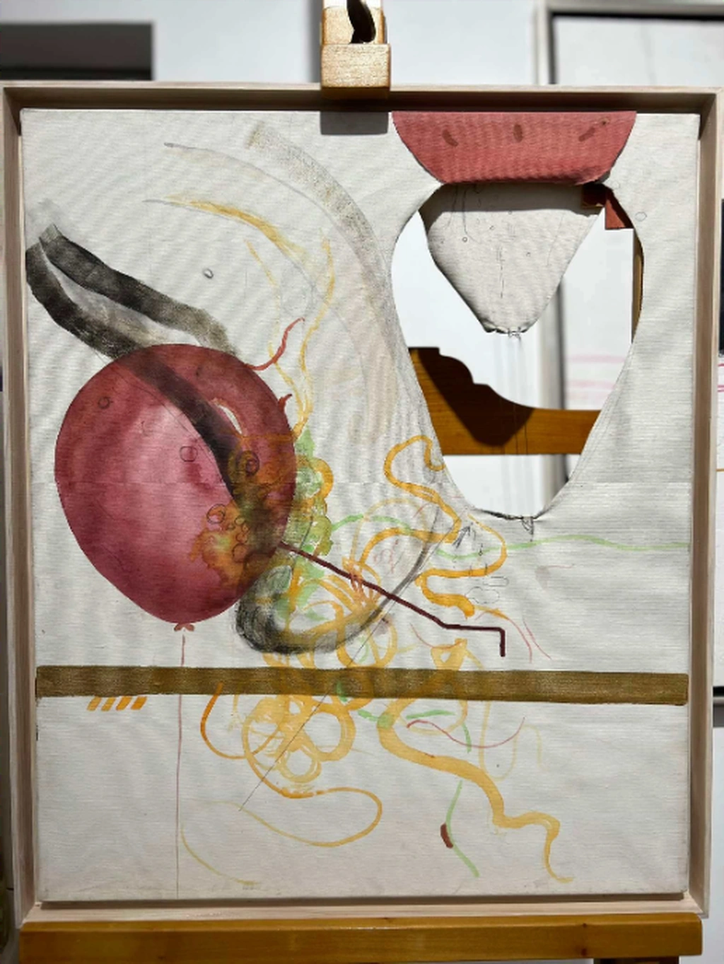 As a Hungarian-Syrian artist known for her conceptual depth, El-Hassan frequently explores themes of human experience, organic structures, and philosophical symbolism. "Gold, Pears, Tangles II" continues this exploration, offering an artwork that transcends traditional still life to become an expression of movement, thought, and artistic inquiry.
