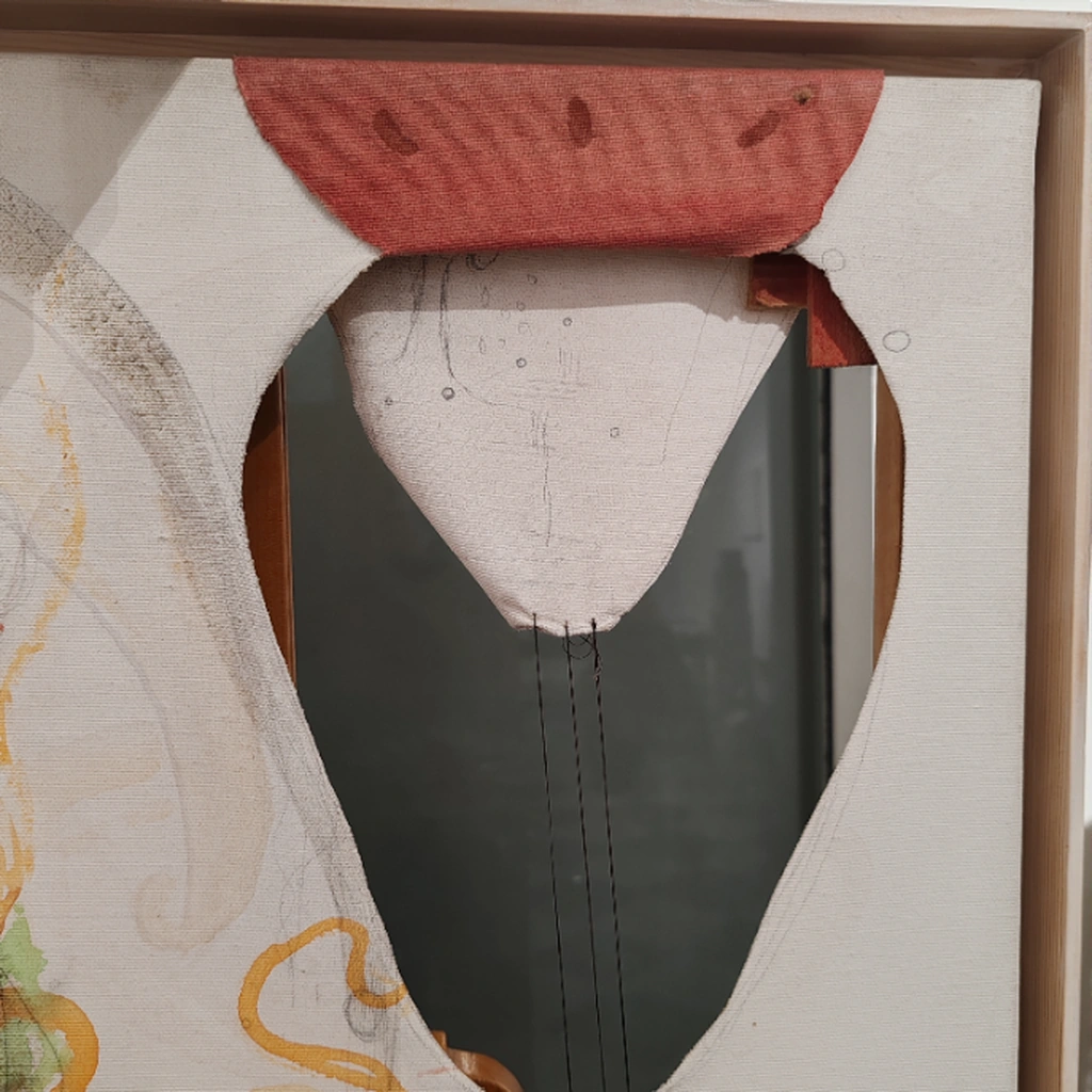 Created using mixed media, this work presents an intriguing balance of rich golden tones, muted pastels, and deep contrasts, resulting in a visually dynamic and thought-provoking piece.