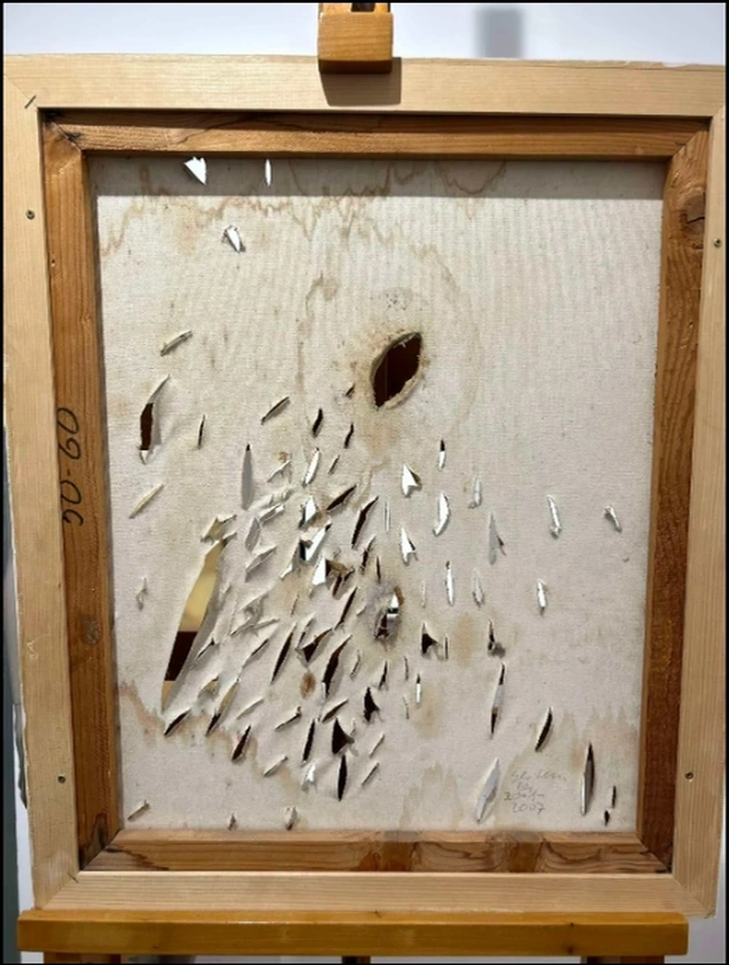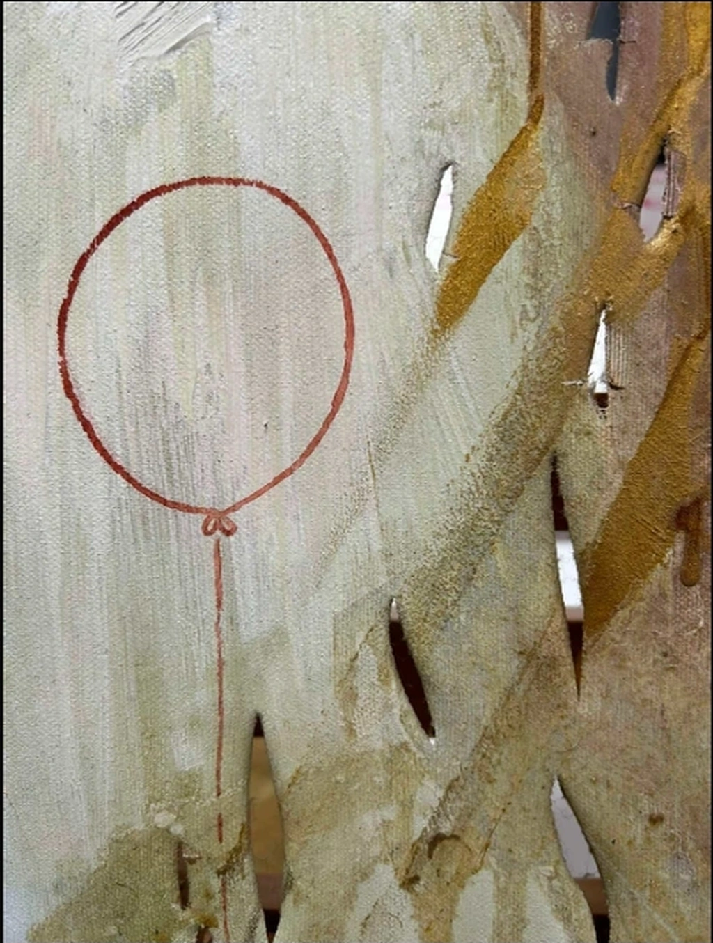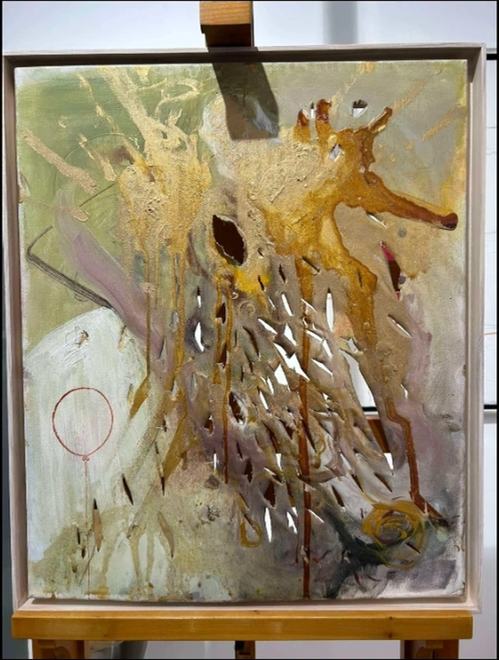 El-Hassan’s masterful use of textured layers and gestural strokes creates an artwork that appears both deliberate and spontaneous. The composition suggests natural decay, transformation, and the passage of time, as elements of still life and conceptual abstraction merge seamlessly. The dripping golden hues and punctured textures give the piece a sense of organic movement and tactile complexity, making it a fascinating study of form and erosion.