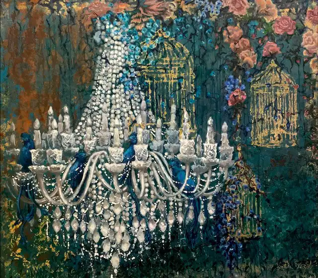 This 140 x 120 cm artwork features a stunning chandelier adorned with intricate, golden birdcages, surrounded by lush, blooming flowers. The combination of metallic golds, deep greens, and earthy tones creates a rich and immersive composition that draws viewers into a world of opulence and whimsy. The artist’s use of oil paints brings out the texture and depth in every element, from the shimmering chandelier to the delicate floral arrangements. This piece embodies a sense of luxury and romance, perfect for adding an enchanted, elegant touch to living rooms, formal dining spaces, or gallery settings. "Golden Cages and Floral Elegance" captures the imagination and transforms any space into a setting of timeless beauty, making it a captivating addition for those who appreciate refined, dreamlike art.