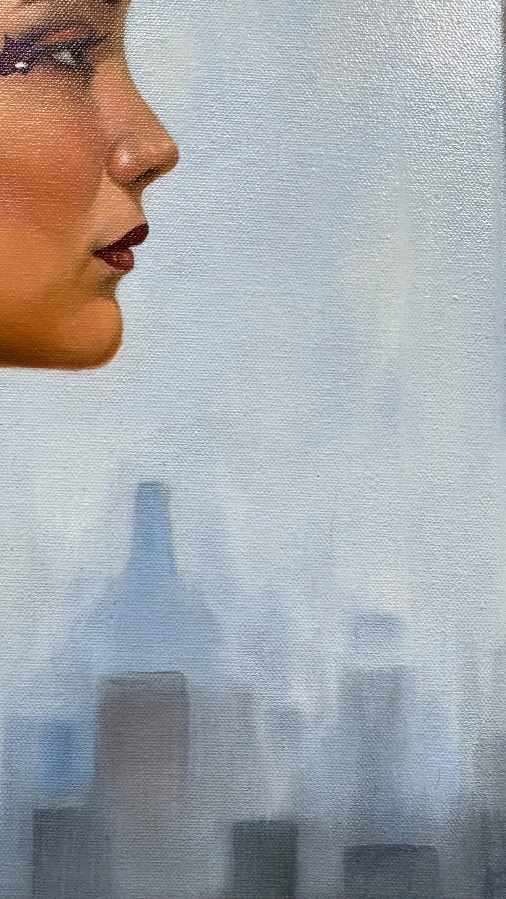 Grace40 by Terri Duan is an evocative oil painting on canvas that bridges the subtle elegance of portraiture with the quiet strength of an urban backdrop.