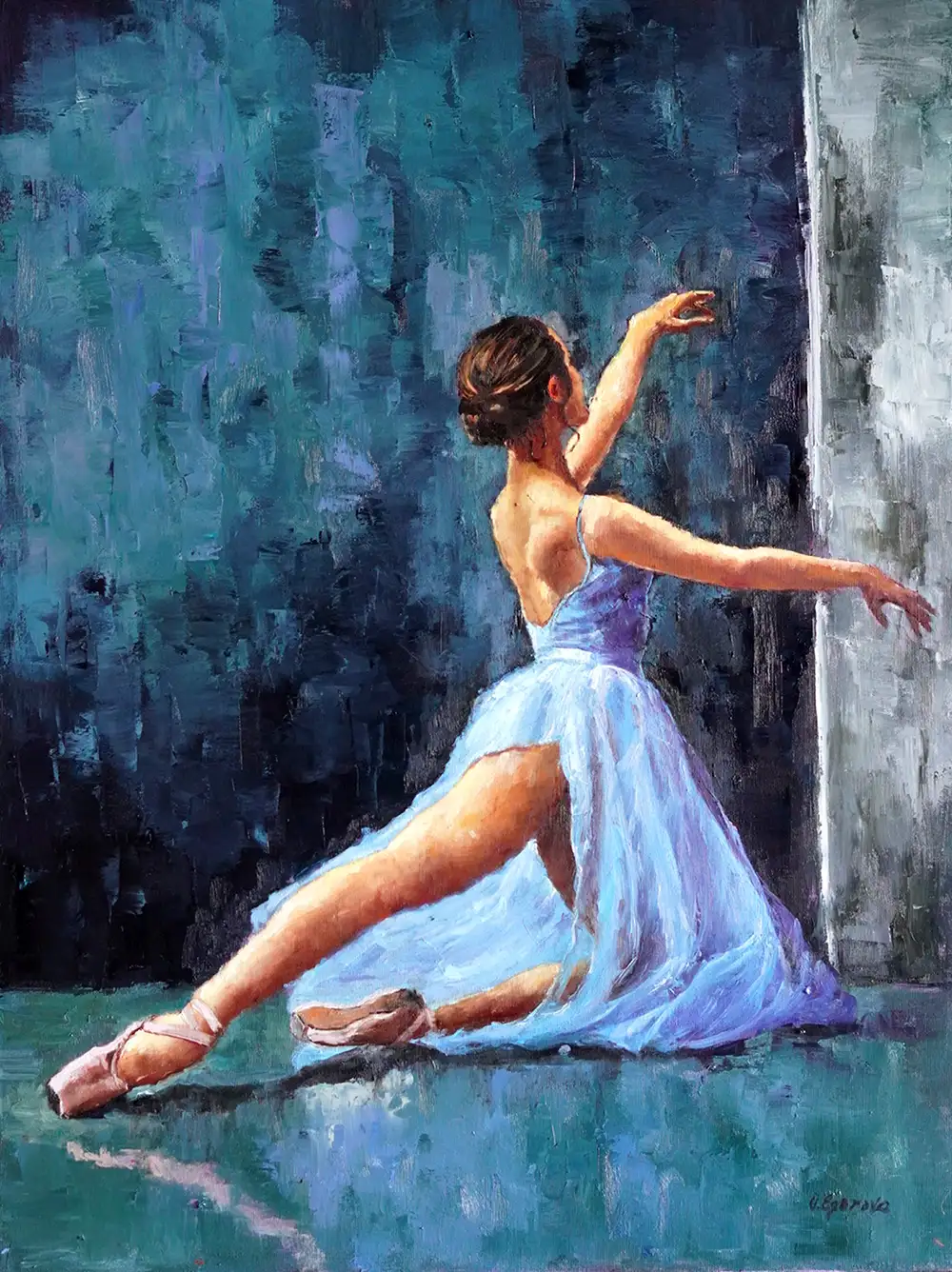 This artwork by Olga Egorov embodies the essence of ballet. The ballerina, depicted with a softness and fluidity that suggests both strength and vulnerability, is caught in a pose that speaks volumes of her dedication to the craft. The painter's use of light accentuates the delicate details of the dancer's attire and the subtle nuances of her form. Set against a cool, abstract backdrop, the warmth of the ballerina's figure draws the viewer into the narrative of her performance. Ideal for spaces that celebrate the arts, such as a dance studio, a living area, or a gallery, this painting evokes the beauty of the ballet.