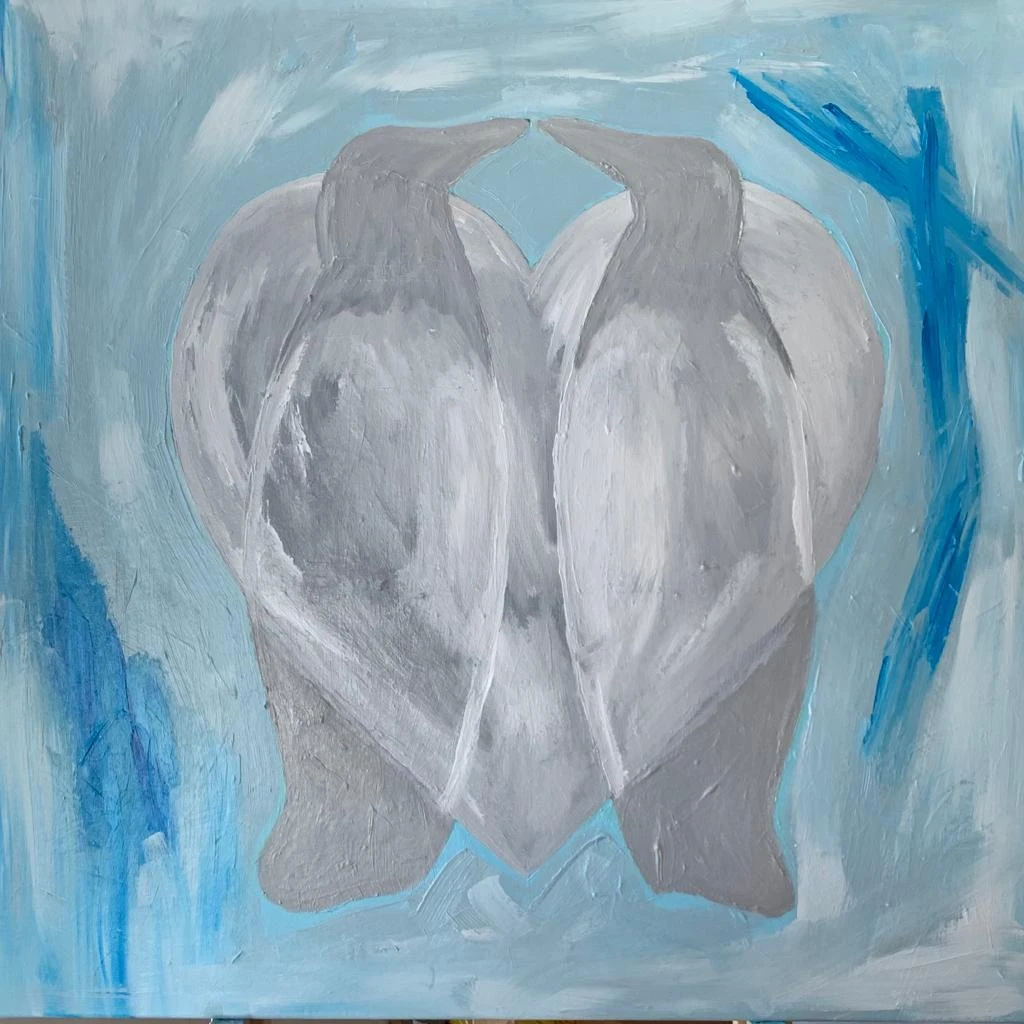 Measuring 70 cm × 70 cm and created using acrylic paints on canvas, this artwork presents two penguins leaning toward each other, forming a heart-like shape. The cool-toned color palette of soft greys, blues, and whites enhances the painting’s tranquil and dreamlike atmosphere, evoking serenity and warmth.