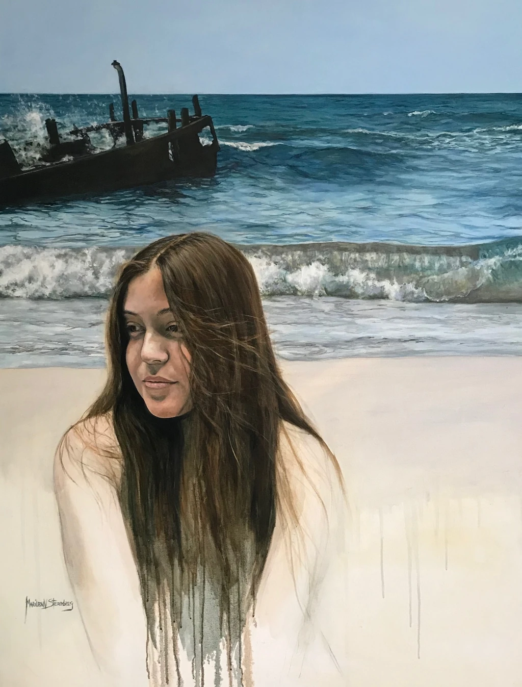 This oil-on-canvas artwork captures the quiet beauty of a windswept beach. A young woman gazes pensively toward the horizon, her expression mirroring the timelessness of the weathered shipwreck behind her. Sterenberg's mastery is evident in her blending of realism with delicate stains and drips, evoking both memory and atmosphere. Perfect for living rooms, offices, or beach houses, this piece brings tranquil reflection to any space.