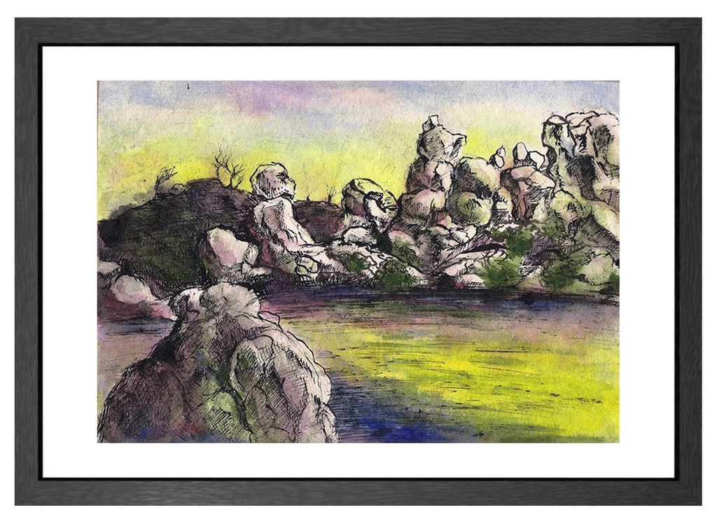 The piece invites the viewer into a mystical natural landscape, where rocky formations reflect gently in still waters under a softly glowing sky. Calderon’s delicate use of soft yellows, greens, and muted blues evokes a dreamlike atmosphere, perfect for creating a peaceful ambiance. Ideal for study spaces or small gallery settings, "Hampi India" celebrates the tranquility of nature and its meditative beauty.