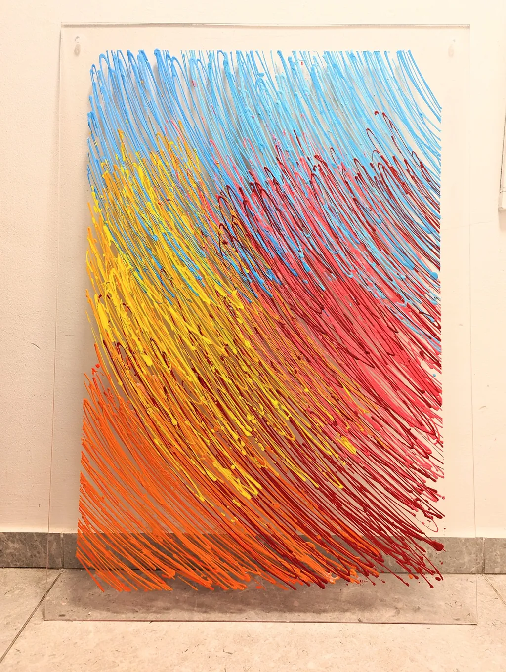 This 100 x 70 cm artwork painted on plexiglass in 2023 features sweeping curves of yellows oranges reds and blues. The overlapping colors create a lively interplay evoking a sense of movement and light.
