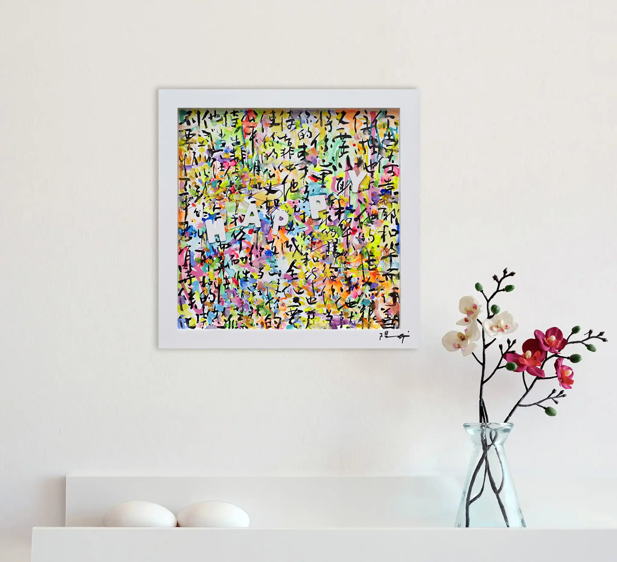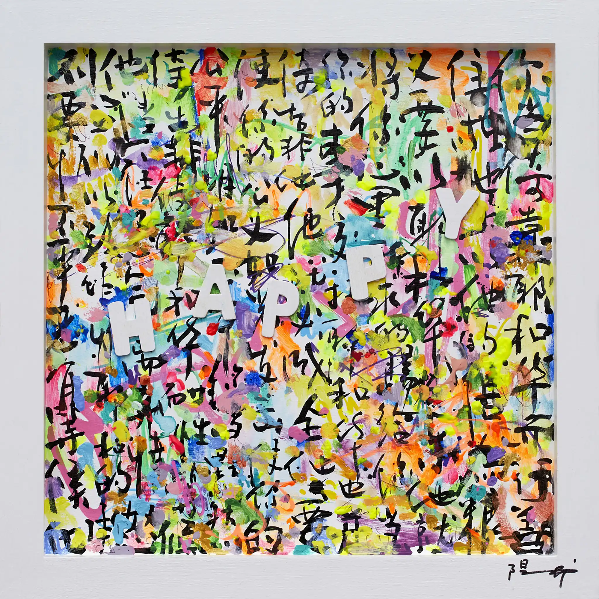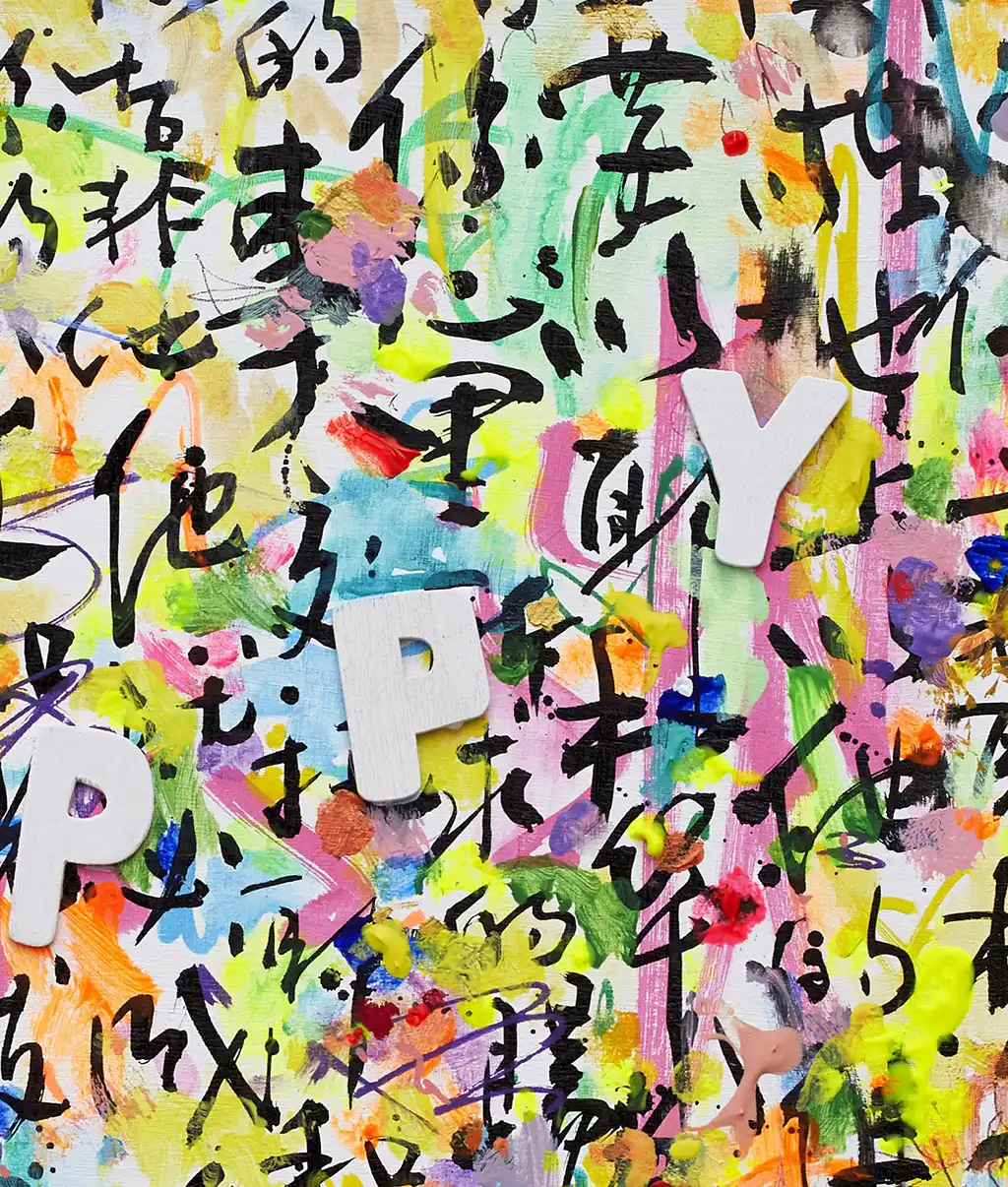 Painted on a wooden tray, the piece blends vibrant acrylic colors, intricate calligraphy, and the bold English letters spelling "HAPPY," creating a dynamic fusion of East and West. The artwork features Xiaoyang Galas' hallmark elements: Chinese characters interwoven with French and English influences, reflecting her deep-rooted cultural heritage and global perspective. With bright, multicolored hues and a playful yet intentional composition, "Happy IV" celebrates life’s beauty while spreading a heartfelt message of peace and love. This artwork is perfect for spaces that thrive on energy and creativity, such as children's rooms, studios, or even modern reception areas. The juxtaposition of text, color, and texture creates a mesmerizing tapestry that uplifts the spirit and brightens any space. Xiaoyang Galas’ talent for harmonizing cultural symbols with universal themes makes "Happy IV" a timeless addition to any art collection.