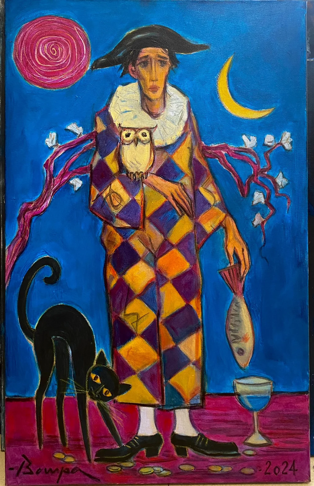 The harlequin, with sorrowful eyes, stands against a deep blue background, holding a wise owl and a mysterious fish, while a black cat arches near golden coins. A crescent moon and swirling red sun add an air of mysticism. This rich color palette of blues, yellows, and reds enhances the melancholic yet enigmatic theme. A piece brimming with symbolism, it is ideal for gallery display, creative spaces, or philosophical interiors. Ioan Bompa’s artistic vision brings depth and emotion, making this painting an intriguing masterpiece.