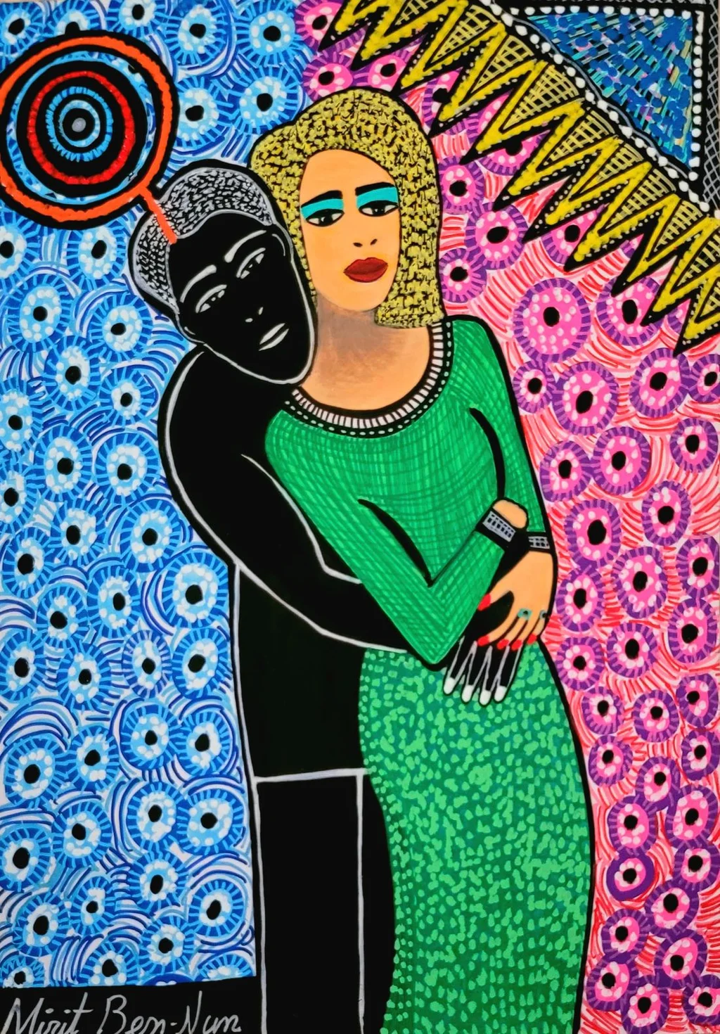 Executed in acrylic on canvas, the artwork is enriched with vivid patterns and multicolor contrasts, creating a dynamic yet intimate atmosphere. The background, divided into two distinct sections of blue and pink with symbolic eye motifs, adds a layer of depth and emotion, symbolizing the watchful presence of external forces or fate. The textured golden hair and detailed facial expressions emphasize the artist’s ability to communicate raw feelings through stylized forms.