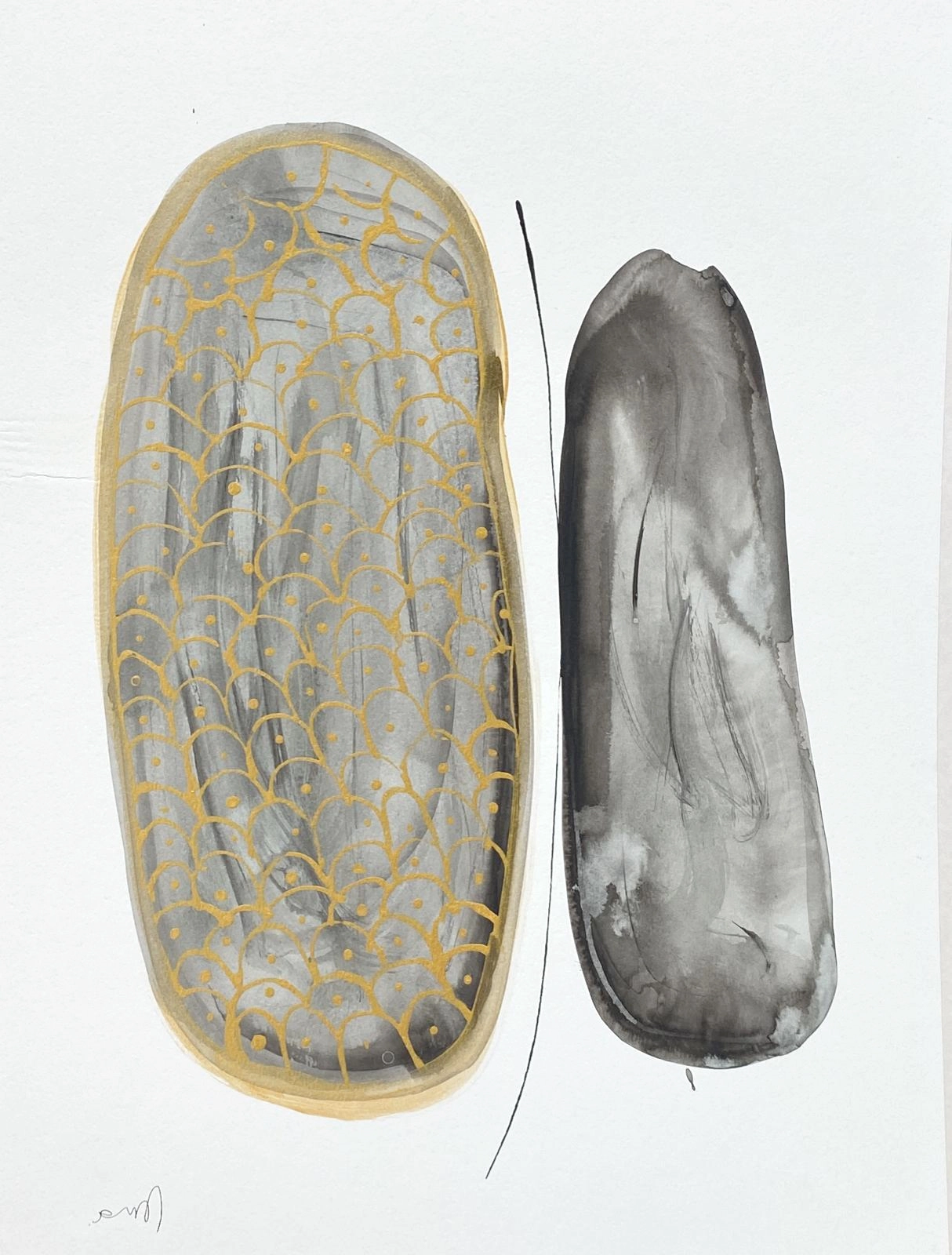 The painting "Hilling" by Neomi Haimovich is an elegant study in minimalist abstraction. The artwork features two elongated shapes, one embellished with delicate gold patterns resembling scales or nets, and the other rendered in a smooth, muted monochrome wash. The use of gold against the grayscale creates a harmonious contrast, adding a touch of opulence to the piece. The overall aesthetic is serene and contemplative, evoking a sense of calm and introspection. The simplicity of the forms combined with the subtle detailing makes this piece versatile, suitable for various settings such as living rooms, bedrooms, or offices, where it can serve as a focal point or a complement to the surrounding decor.