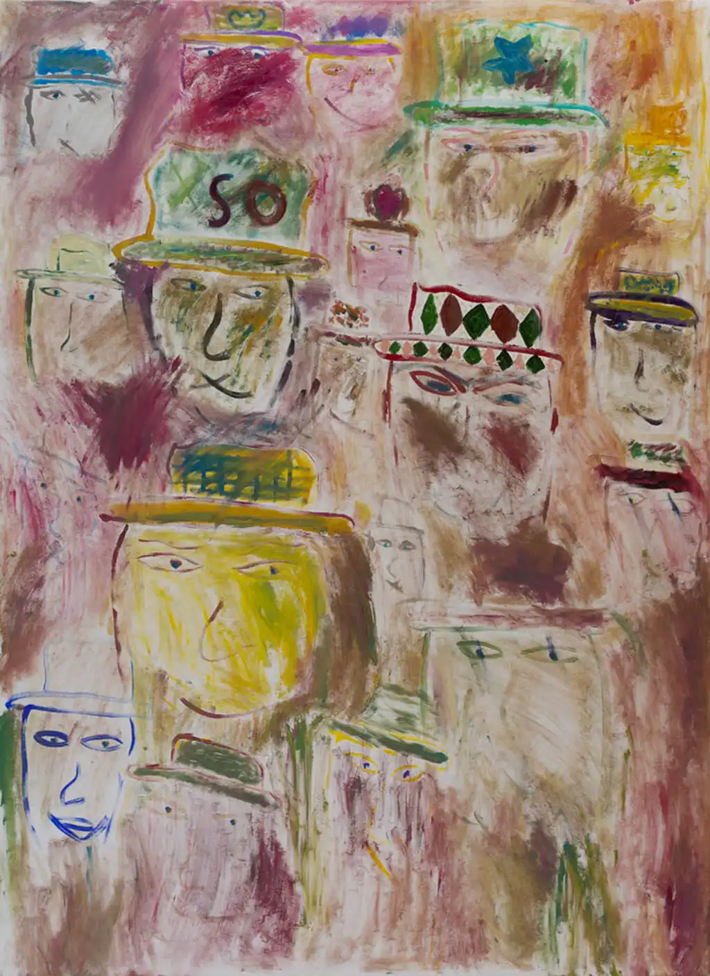 The painting's abstract representation of faces, each adorned with distinct hats and expressions, evokes a sense of curiosity and introspection. It reflects Halfon’s ongoing exploration of personal and societal themes, using portraiture as a means to express the multifaceted nature of human identity. The whimsical and dreamlike atmosphere of the piece, combined with its mysterious undertones, suggests a narrative that is open to interpretation. The repetition of facial features and the blending of colors contribute to an overall feeling of ambiguity, making the viewer ponder the relationships between the characters and their possible connections to the artist's own experiences. "Him Me I" is a powerful statement piece that would make a stunning addition to any living room, office, or gallery. Its introspective nature and rich visual texture make it ideal for spaces where it can be appreciated up close, allowing viewers to engage with its intricate details and layered meanings.