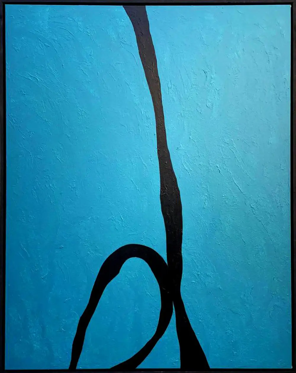 The painting "Hold" by the artist Link features a minimalist composition with a prominent black abstract form set against a textured blue background. The simplicity of the design highlights the contrast between the black shape and the blue backdrop, emphasizing the elegance of the lines and the depth of the texture. The color palette is dominated by the cool, calming blue, complemented by the stark black form. The lighting is even, enhancing the clarity and impact of the contrasting elements. The style is modern and abstract, evoking a sense of tranquility and contemplation. The mood is serene and reflective, inviting the viewer to explore the interaction between the form and the background. This piece would be a perfect fit for a modern living room, office, or study, where its calming colors and minimalist design can be appreciated.