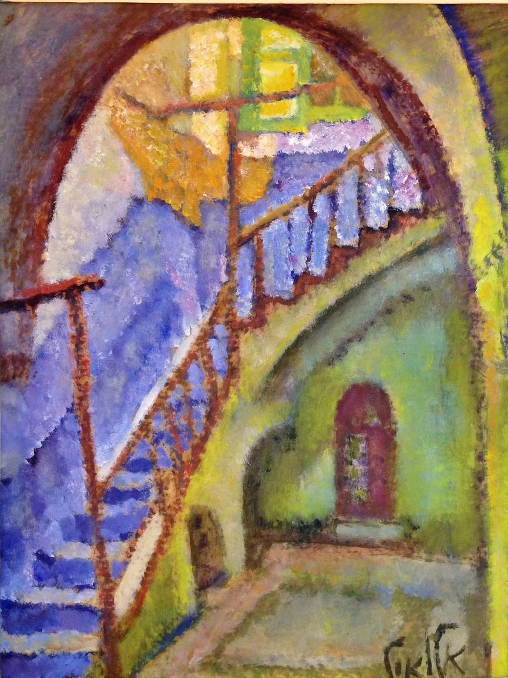 The central staircase, bathed in soft light and vibrant hues, leads the viewer’s eye into the depths of the painting, evoking a sense of curiosity and movement. The surrounding archways and interior details add depth and structure, enhancing the overall feeling of serenity and homeliness. This balance between bold, expressive strokes and delicate detailing gives "Home Interior" a unique energy—both grounded in reality and infused with artistic imagination.