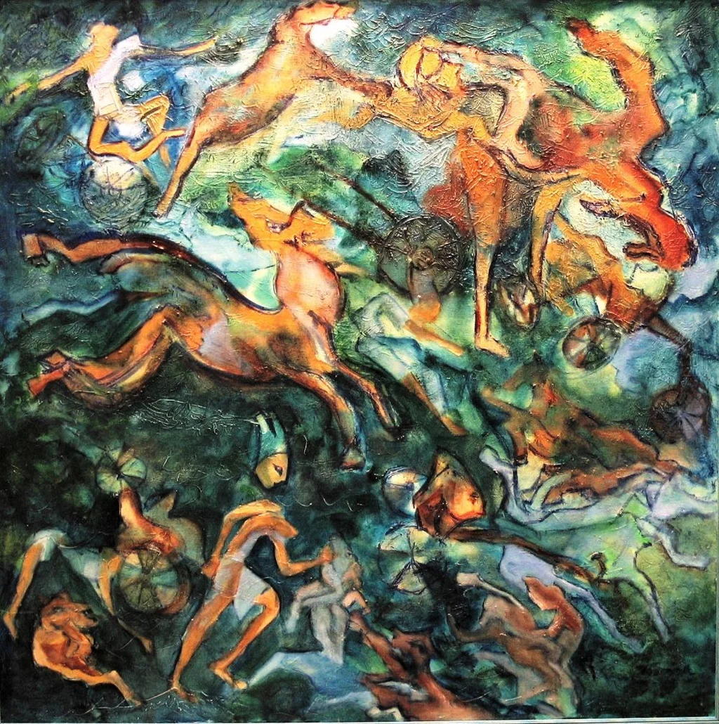 Executed in a bold expressionist style, this textured artwork portrays powerful horses galloping, riders leaping, and ancient chariots racing, evoking a scene of mythology, history, and boundless momentum.