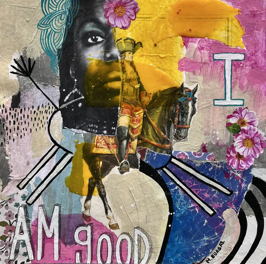 The artwork employs a bold color palette, with bright yellows, pinks, and blues dominating the scene. These colors, combined with the contrasting textures and patterns, contribute to a vibrant and energetic atmosphere. The central figure, a rider on horseback, is juxtaposed with abstract elements and expressive text, inviting viewers to explore themes of empowerment and self-assurance. The use of floral motifs and hand-drawn accents further enhances the piece's intricate design, adding layers of meaning and visual interest. “I am good” is a versatile piece, suitable for various spaces such as home offices, studios, or intimate gallery settings. Its small size allows it to make a personal and impactful statement, adding a touch of creativity and boldness to any environment. Burgaz’s signature style is evident in this work, reflecting her unique approach to mixed media and her skill in conveying complex emotions through visual art.