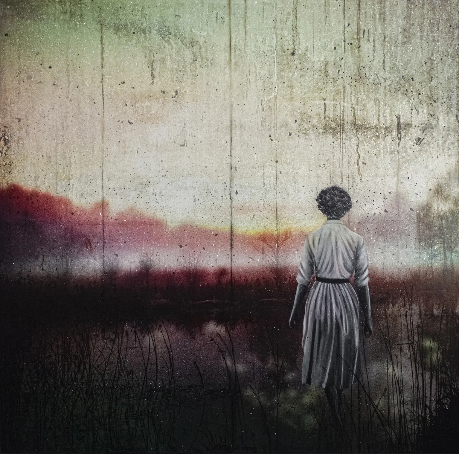 I’m Leaving by db Waterman is a hauntingly serene mixed media painting showing a solitary figure walking into a fading, misty landscape.