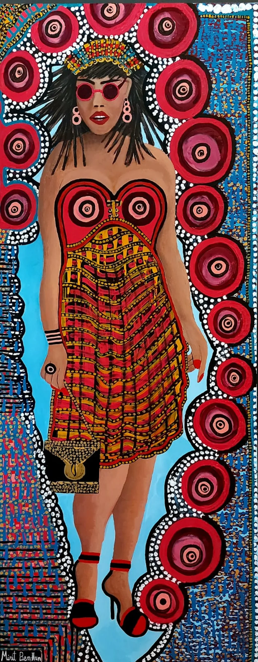 Executed in acrylic on canvas, this piece bursts with vibrant reds, deep golds, and bold contrasts, creating a sense of drama and self-expression. The swirling circular patterns framing the figure reinforce the painting’s dynamic energy, symbolizing strength and individuality. The confident posture, direct gaze, and carefully curated outfit all point to a celebration of self-assurance and style.