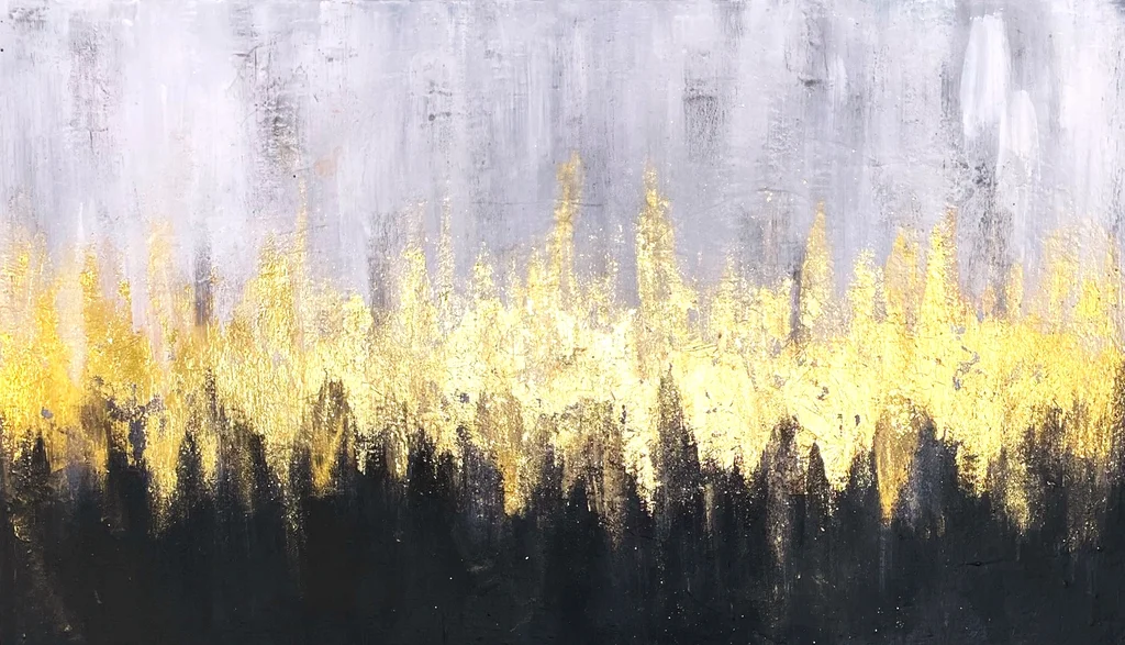 The color palette is a sophisticated blend of deep black, moody grays, and soft whites, symbolizing the balance between mystery and clarity. The golden textures shimmer across the canvas, reminiscent of a city skyline at dusk or an ethereal golden horizon emerging from the shadows. The bold contrast and expressive brushwork evoke a sense of energy, transition, and luxury.