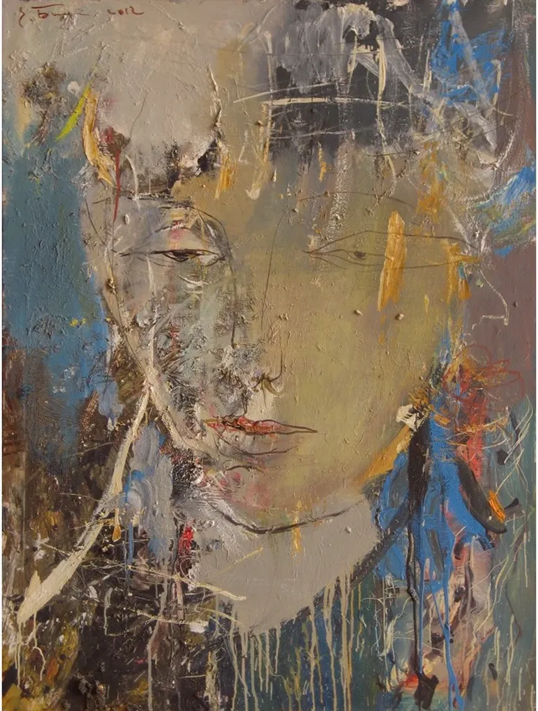 This 120x90 cm oil on canvas painting presents a fragmented yet contemplative face, emerging from a celestial blend of muted earth tones, deep blues, and warm yellows. The ethereal brushwork, layered textures, and subtle hints of red and white create an impression of weightlessness, as if the subject exists beyond time and space.