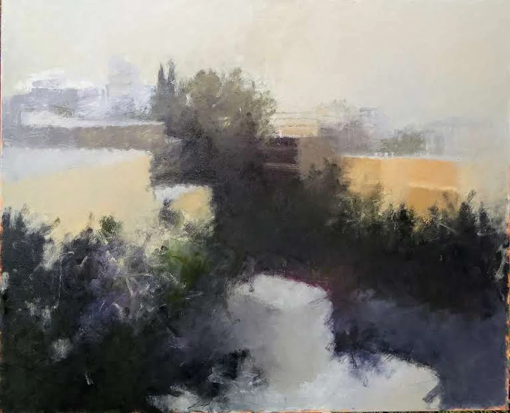Arbel’s brushwork is delicate yet expressive, creating a composition that hovers between reality and abstraction. The blurred edges of structures and foliage suggest movement and time passing, giving the painting a nostalgic and contemplative mood. The layering of colors enhances the ethereal effect, making the city appear as if it is dissolving into the warm, sunlit air. The result is a serene yet dynamic scene that captures the soul of Tel Aviv in a way that is both familiar and enigmatic.