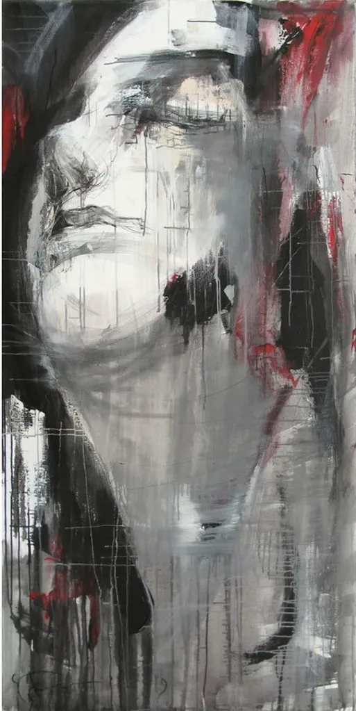 This 200x100 cm oil on canvas painting features a solemn face bathed in muted grays and deep blacks, creating an impression of quiet introspection. Subtle red accents add warmth and emotion to the composition, contrasting with the soft highlights that evoke a dreamlike atmosphere.