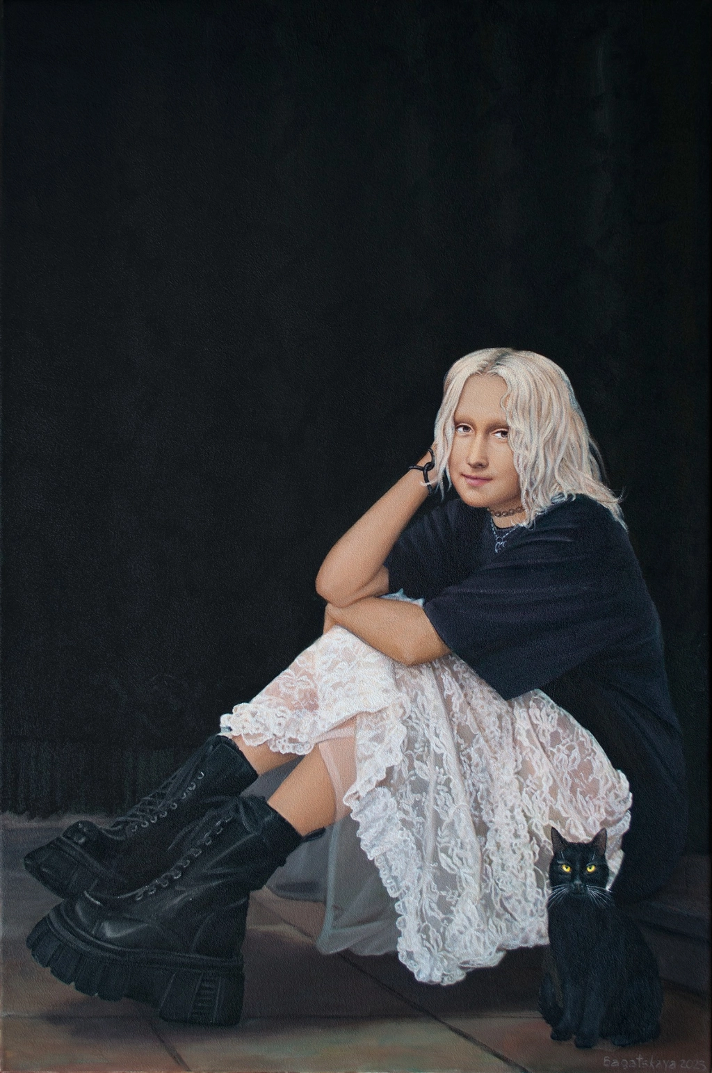 The stark black background emphasizes the subject while the delicate lace details of her skirt introduce softness and contrast. The interplay of neutral tones and subtle accents creates a harmonious yet striking palette. The contemplative atmosphere and elegant simplicity make this piece a perfect addition to galleries studies or serene living spaces. Bagatskaya’s attention to detail and symbolic depth shine through in this timeless portrayal of quiet elegance.