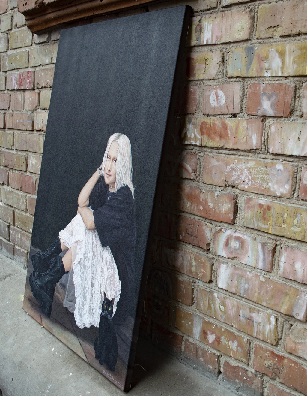 Created in 2024 this 80x65 cm painting is crafted with artistic texture paste and Amsterdam™ acrylic paints on Unico™ cotton canvas. The artwork features a seated woman in layered black and white attire exuding calm introspection. A black cat with piercing yellow eyes accompanies her adding an element of mystery to the scene.