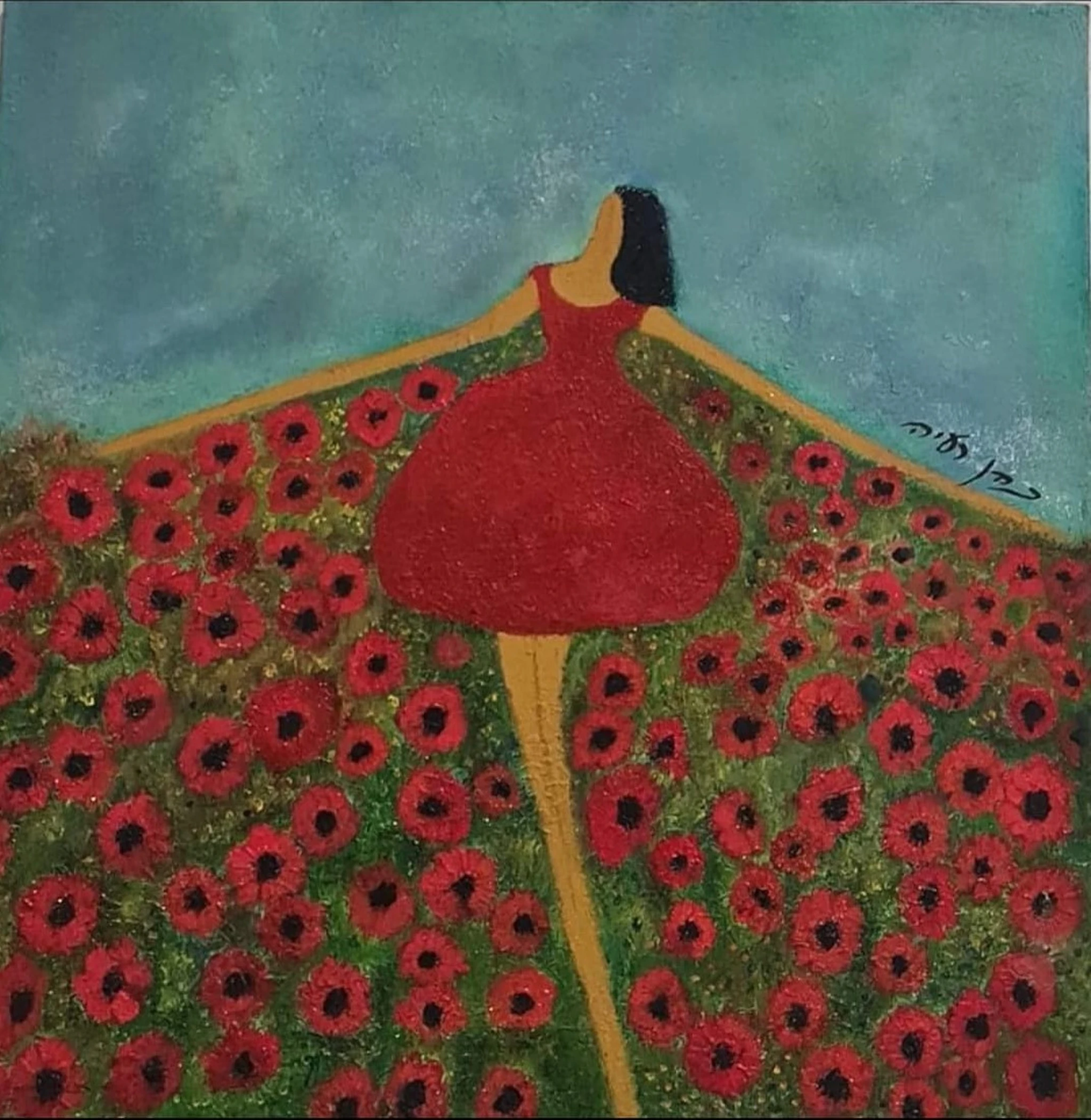 Known for her nostalgic depictions of childhood memories, Cohen frequently illustrates young women in red dresses, immersed in whimsical landscapes. In this piece, a faceless woman stands gracefully in a sprawling field of red poppies, arms wide open, absorbing the boundless beauty of nature.