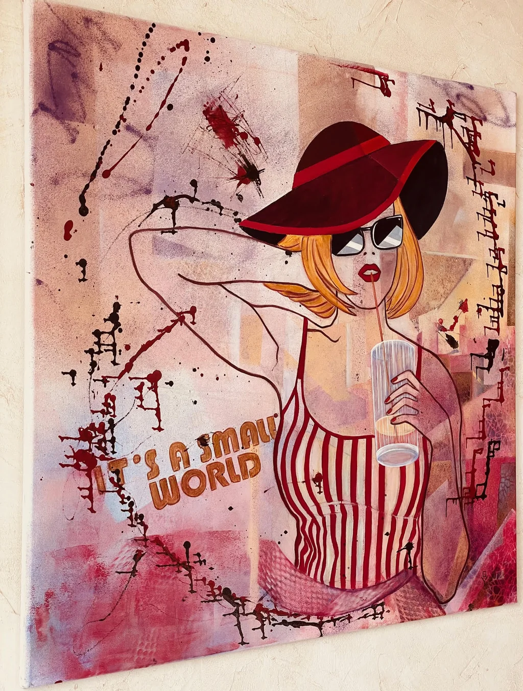 This striking Pop Art piece captures the essence of modern lifestyle through the stylized depiction of a confident woman sipping a drink her chic sunglasses and red hat making a stylish statement. The painting’s palette features bold reds and pinks contrasted with soft peach tones and black accents creating a trendy and urban vibe.