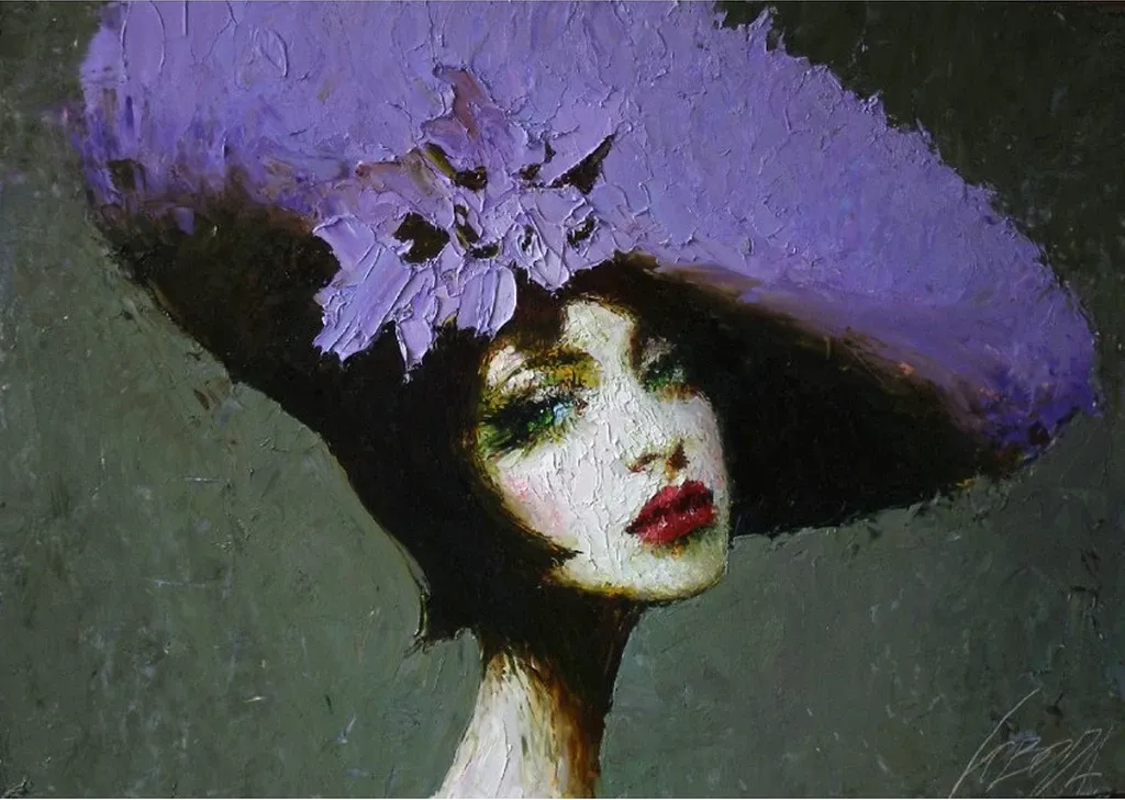 The portrait features a striking female figure adorned with a dramatic lavender hat, textured in thick brushstrokes that create movement and depth. Her pale skin, contrasted against bold red lips and deep green undertones, adds an air of sophistication and enigma. Loboda’s signature painterly textures and fluid compositions breathe life into this work, making it both modern and timeless. The expressive details in her eyes and lips hint at untold emotions, drawing the viewer into a world of feminine strength and quiet contemplation. Whether displayed in a luxury lounge, art gallery, or private collection, "Jackie" transforms any space with its striking presence and artistic brilliance. A perfect acquisition for those who appreciate expressive portraiture and avant-garde aesthetics.