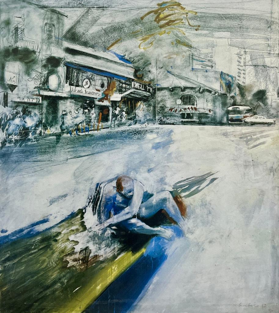 The style blends Impressionism with modernist elements, utilizing loose brushstrokes and layered textures to build the scene. Schwebel's technique merges detailed urban landscapes with expressive figures, illustrating his mastery in portraying both environment and emotion. This piece would be a striking addition to spaces like a living room, office, or hallway, offering a thought-provoking glimpse into Jerusalem's urban life.