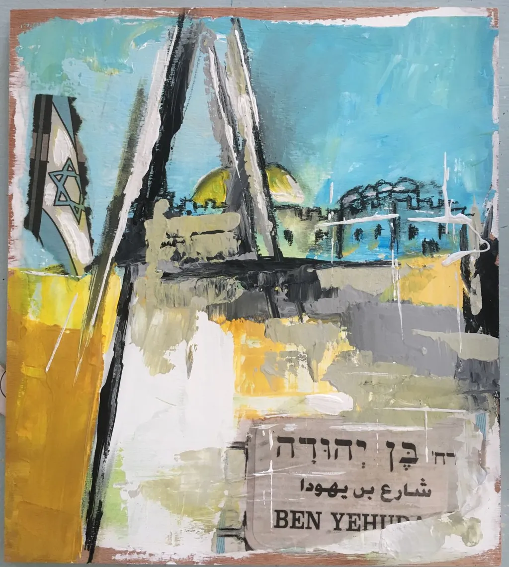 A striking feature of the artwork is the interplay between warm earth tones—ochre, yellow, and beige—contrasted with a cool sky blue, creating a dynamic yet harmonious composition. The bridge structure in the foreground, seemingly fragmented, symbolizes the connection between past and present. The Israeli flag and the golden domes in the background reflect the city’s deep-rooted history and spiritual significance.