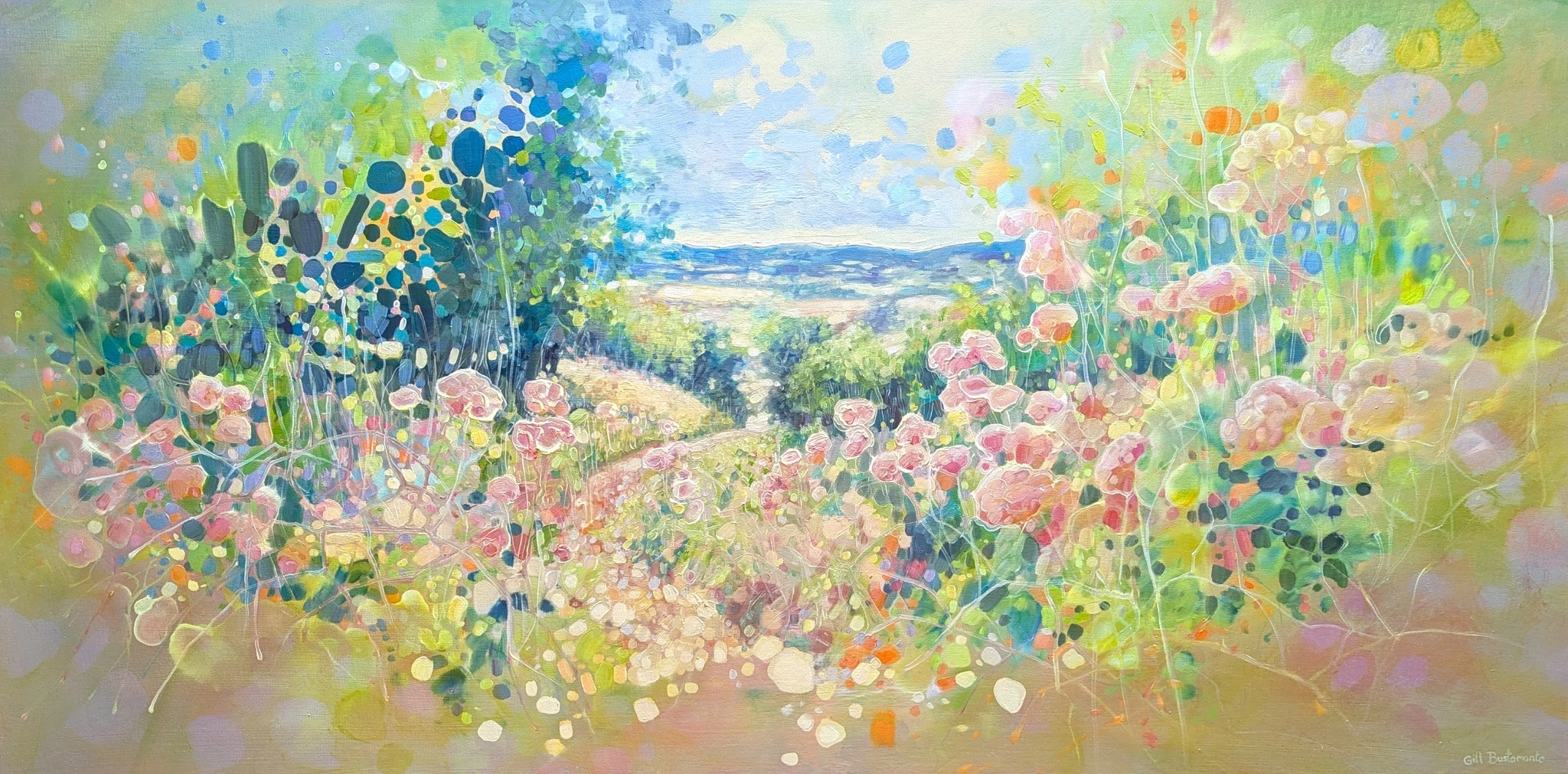 “July Dissolving” by Gill Bustamante captures the fleeting beauty of summer through a dreamy, floral-draped countryside path. Painted in oil on a 48×24 inch canvas, this semi-abstract piece radiates soft pastels, warm sunshine, and the delicate textures of blooming wildflowers. Gill’s signature style, blending impressionism with memory-inspired abstraction, transforms the landscape into a moment suspended in time. This serene and joyful work is ideal for tranquil, light-filled spaces that invite calm and reflection.