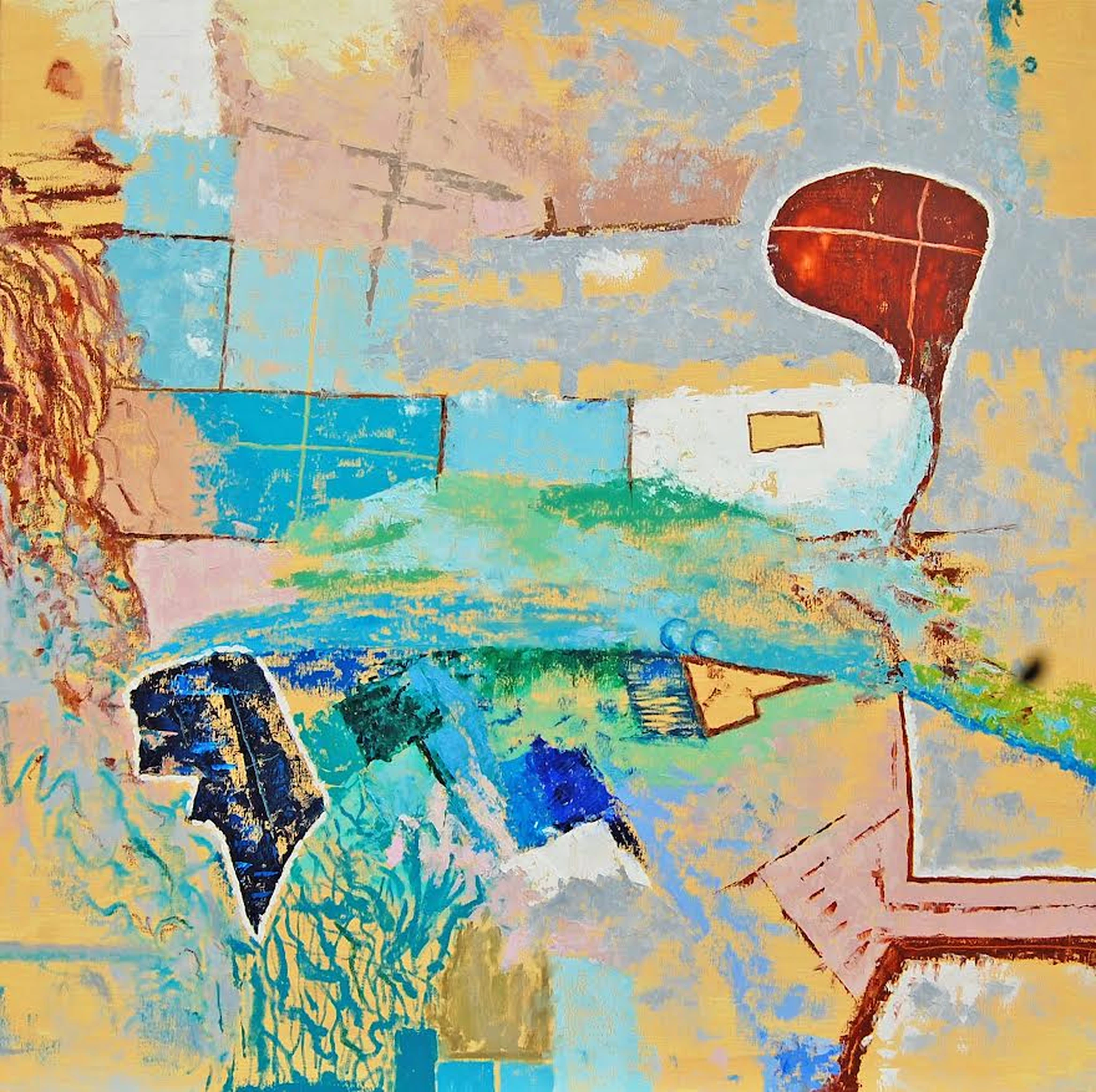 Drawing inspiration from the coastal landscapes and his deep connection to nature, Cal layers tones of blue, green, and warm earth hues to create a harmonious composition. The textured application and geometric elements blend seamlessly, illustrating the artist’s dedication to exploring abstraction while retaining hints of figuration. The piece exudes an airy, peaceful quality, reminiscent of a sunlit day by the shore.