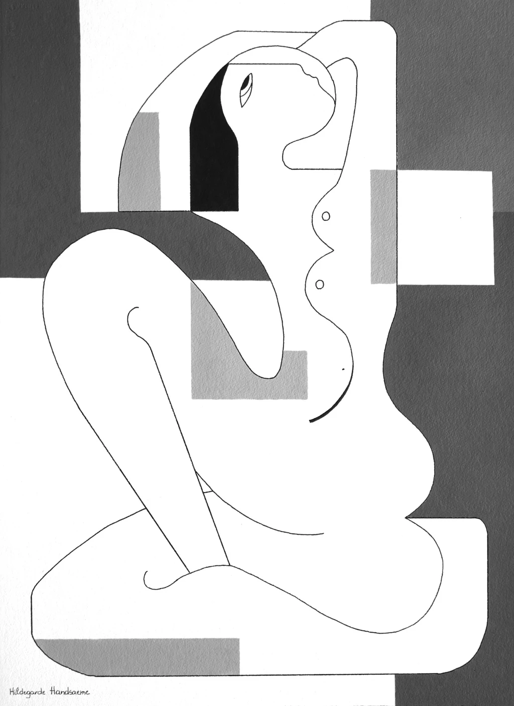 This 76cm x 55cm acrylic painting on Canson paper showcases an elegant female figure, outlined with fluid black lines against a geometric background of black, white, and gray. The composition exudes serenity and mystery, inviting contemplation.
