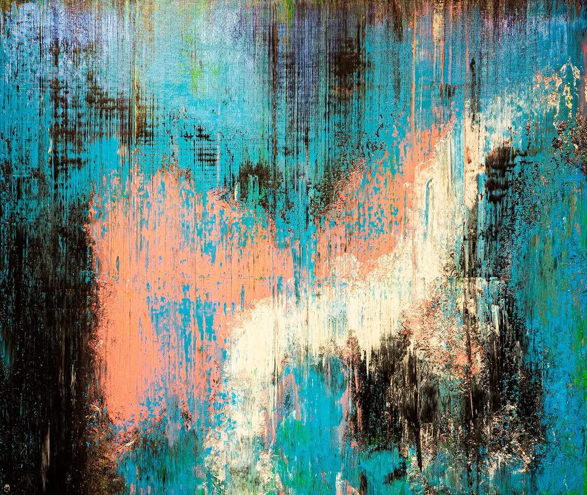 In Regina Goldelman's abstract artwork "Lady in the Lake", we see a harmonious collision of texture and color. The depth of the blues juxtaposed with the warmth of coral hues invokes the mystique of serene, deep waters and their ancient tales. Streaks of white and black add to the complexity, suggesting ripples or reflections on the water's surface. This piece conveys both the calm and the unknowable depths of a lake, making it a captivating choice for contemplative spaces such as a private study, a tranquil spa, or a reflective corner in a home or gallery.