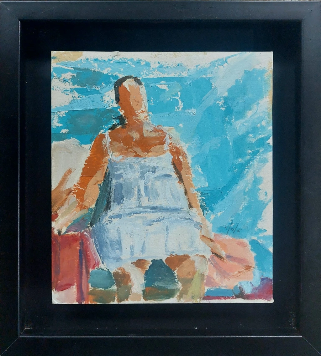 The juxtaposition of soft whites and vivid blues lends the composition a fresh and modern appeal, while the woman’s form remains central, evoking a sense of simplicity and quiet contemplation. The painting exemplifies Rodriguez’s versatility, showcasing his ability to transcend traditional realism and venture into abstract representation.