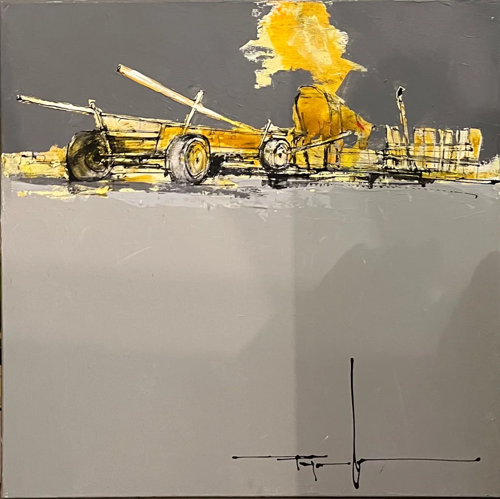 The contrast between the muted gray tones and warm yellow highlights creates a sense of stillness and nostalgia. The minimalist approach, combined with expressive brushstrokes, enhances the rustic charm of the scene. Perfect for contemporary interiors, farmhouse decor, or gallery displays, this piece embodies the beauty of simplicity. Mugur Popa’s signature style brings depth and emotion to this peaceful composition.