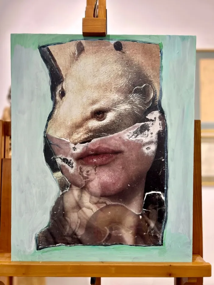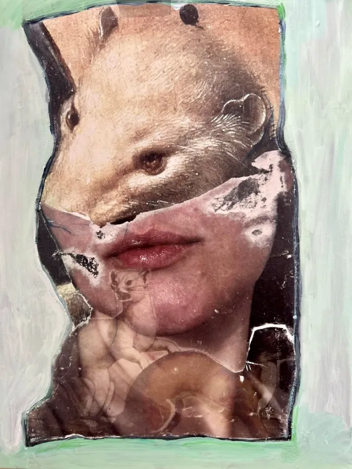 This collage on canvas merges a human face with the eerie presence of an animal head, creating a visual riddle that hovers between transformation and dream-state. The skin folds, textures, and photographic realism are layered with conceptual distortion, evoking the tension between the physical and the imagined.