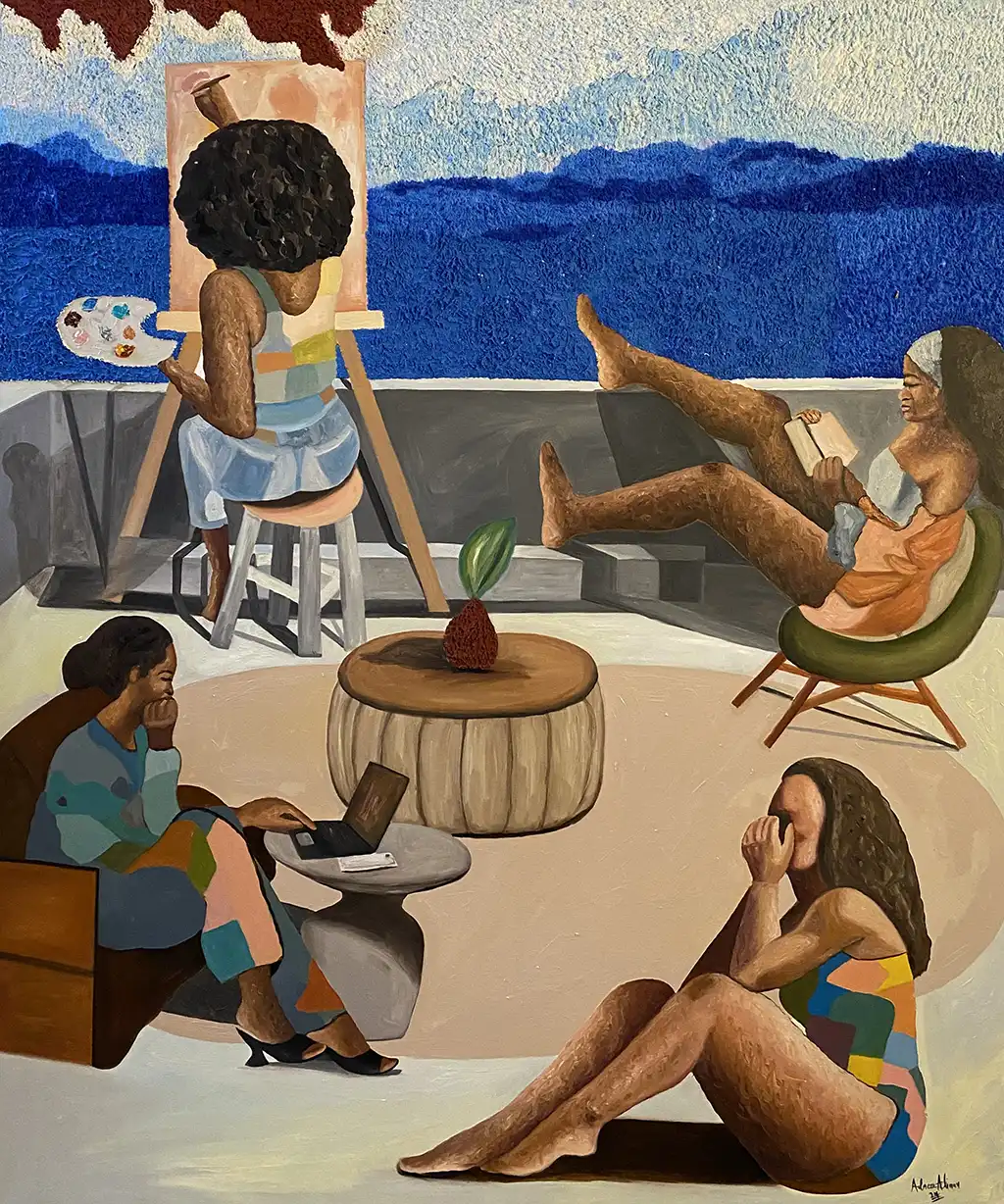 The composition is bright and earthy, with blue tones framing the peaceful outdoor backdrop. Adinnu’s figurative style breathes life into the serene moments shared among women enjoying art, reading, and quiet contemplation. This piece evokes a convivial and peaceful atmosphere, perfect for spaces like living rooms, patios, lounges, or outdoor reception areas, where its vibrancy can uplift the environment.