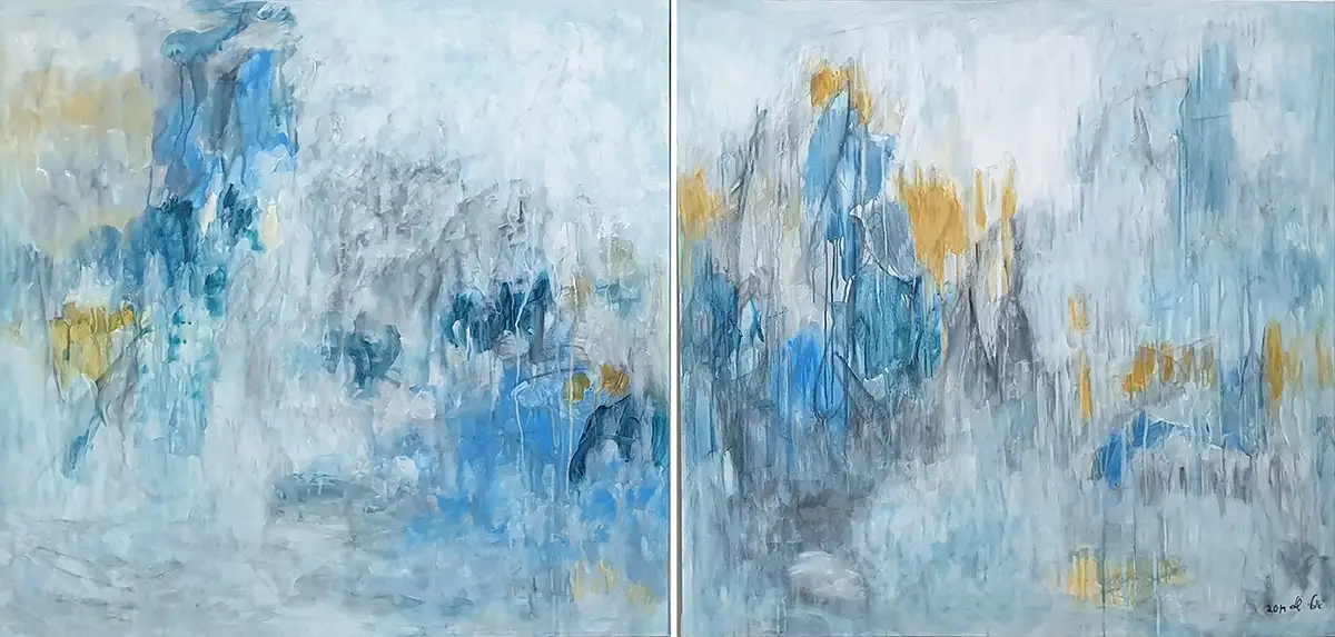 An abstract diptych painting by Orly Shalem, radiating a cool, airy atmosphere with touches of golden warmth, embodying a sense of hopeful clarity