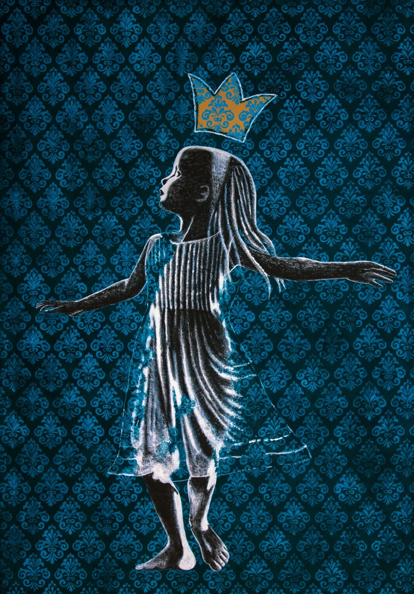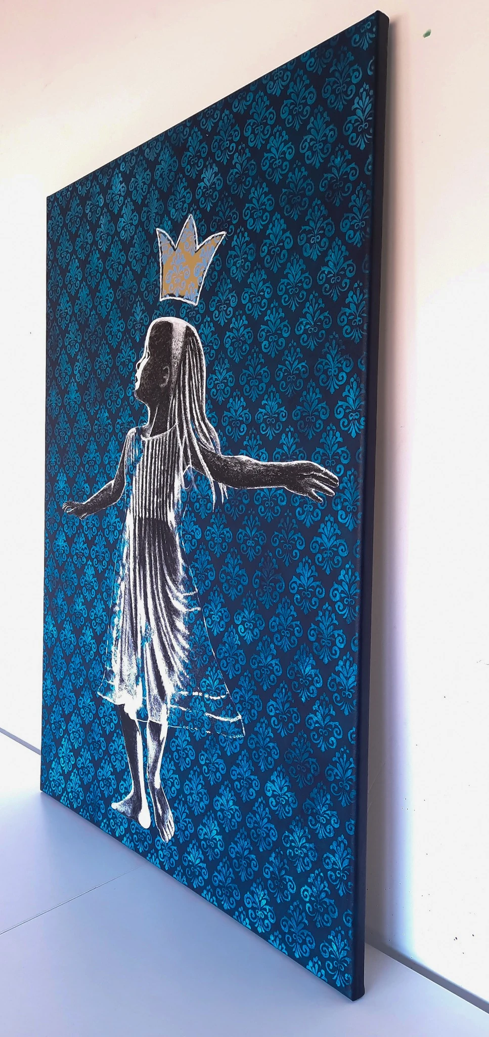 Measuring 100 x 70 x 2 cm, the artwork features a young girl poised gracefully in a moment of dance, adorned with a golden crown. The elegant teal damask-patterned background enhances the regal and whimsical tone of the piece, evoking a sense of fantasy and imagination. Waterman’s mastery of acrylics is evident in the ethereal quality of the girl’s flowing dress and the interplay of light and shadow, which imbue the figure with life and movement. The delicate balance between the bold decorative backdrop and the softness of the central figure creates a narrative that blends nostalgia with a fairytale-like charm. This piece serves as a reminder of the fleeting moments of childhood magic and the beauty of uninhibited joy. Perfect for bedrooms, living rooms, or gallery spaces, "Little Dancing Queen" brings elegance and warmth to its surroundings, making it a delightful addition to any art collection.