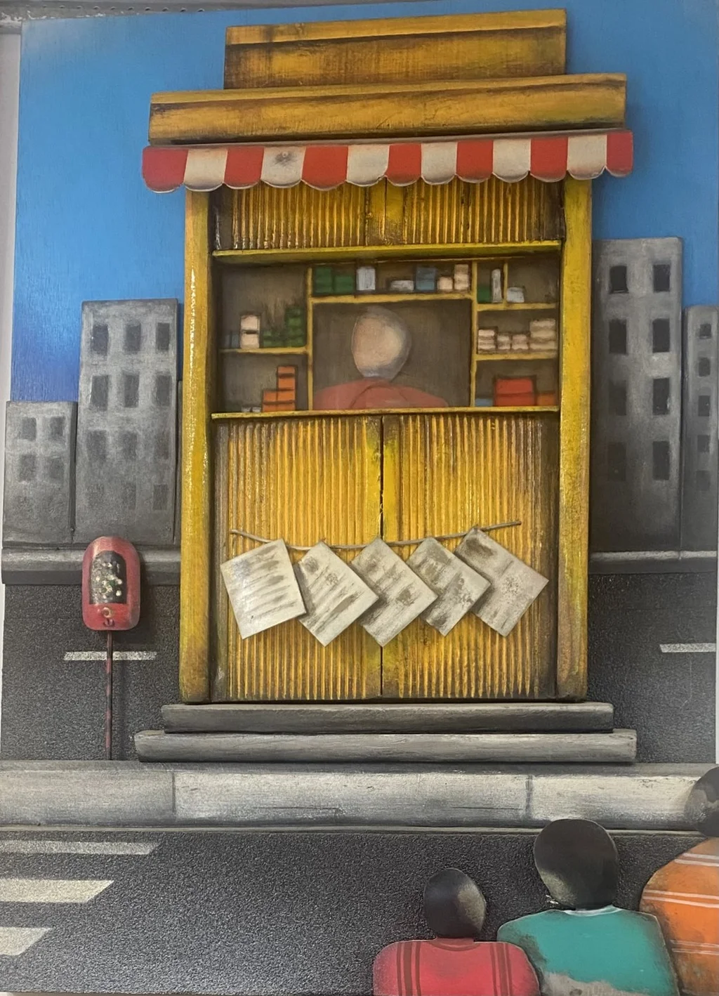 LITTLE GREEK SHOP, 2025 An Urban, Mixed Technique, Painting